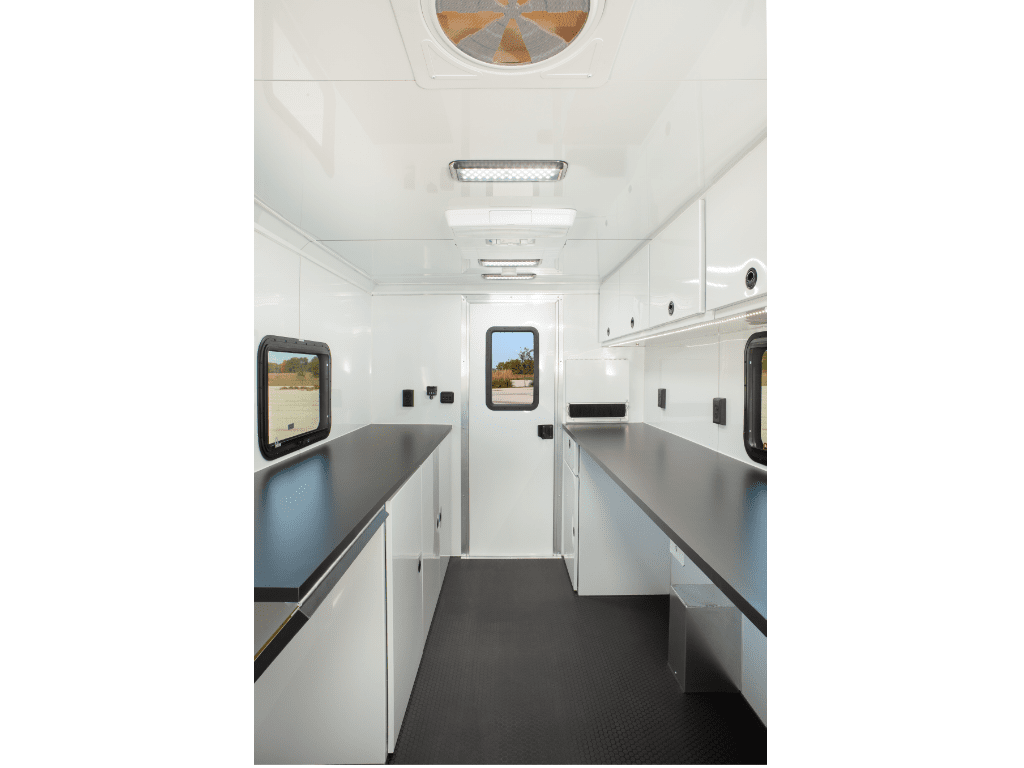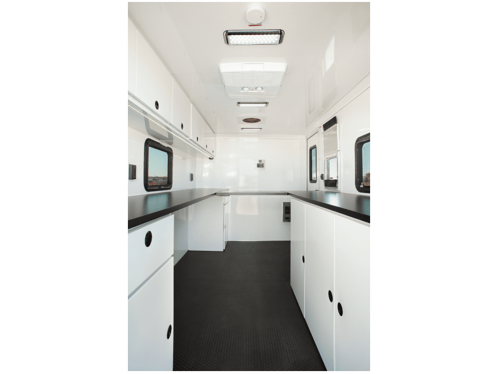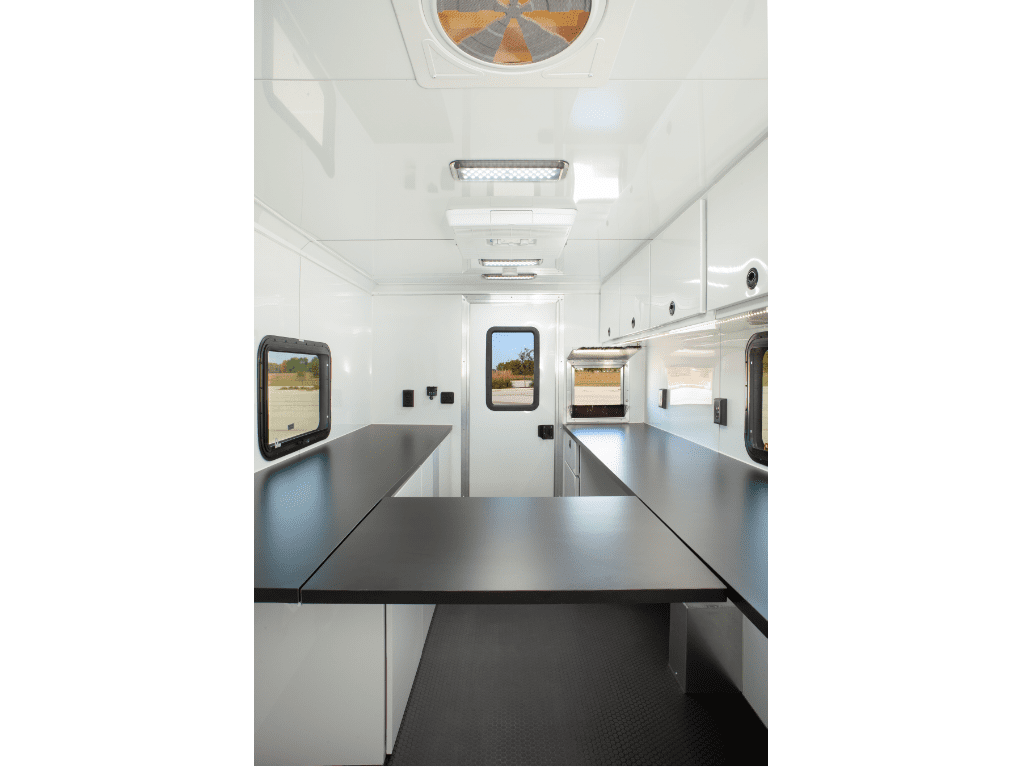 The fiber splicing trailer from ATC is the ultimate workspace. Built with an 8″ aluminum mainframe for extreme durability. Comes standard with heat and A/C to keep you comfortable in any weather, plus 14′ LED ceiling lights and under cabinet lights. This is the upgraded Plus package with a 4.5KW generator and a 30-gallon fuel tank included.